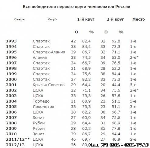 В 5-й раз за 20 российских чемпионатов (без учета самого первого 1992 года, когда отсутствовала туровая система) лучшим клубом по итогам первой половины оказался ЦСКА. Ранее лишь 6 раз победителям первого круга в итоге не удалось стать чемпионом ("Крылья Советов"-2001 и "Торпедо"-2004 даже не попали в тройку призеров, финишировав лишь пятыми). При этом армейцы, подтвердив свой уверенный старт в 2003-м и 2006 годах, в двух других случаях упустили чемпионство. В сезоне-2002 - лишь в золотом матче с "Локомотивом", а в минувшем первенстве - и вовсе заняв в итоге 3-е место. Причем в чемпионате-2011/12 ЦСКА показал абсолютно худший результат во второй половине первенства среди всех победителей первой, набрав только 40,9 процента очков.